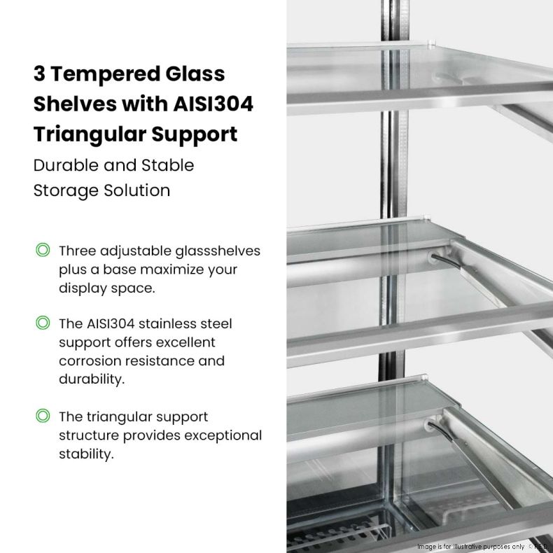- Adjustable Cake Displays: With three adjustable glass shelves