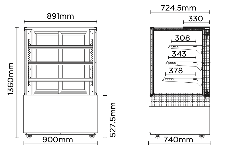 - Large display area and 3 adjustable shelves plus base to showcase all your hot delicacies.