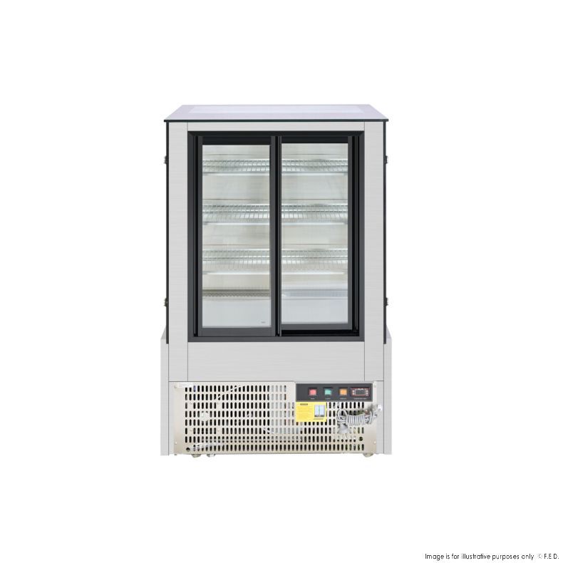 This deluxe cake display has three adjustable shelves, powerful secop compressors for functionality, a stainless-steel frame for sturdiness, LED lighting to ease interior viewing, digital temperature control and a triple glazed front with heated filaments.