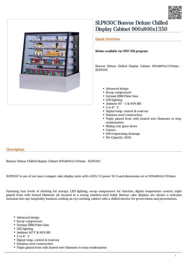 SLP830C is one of our more compact cake display units with a 820/10 power W/A and dimensions set at 900x800x1350mm.