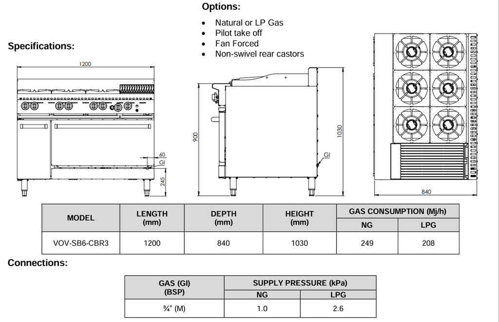 B+S Verro Combination Ovens with Six Burners & 300mm Char Broiler VOV-SB6-CBR3