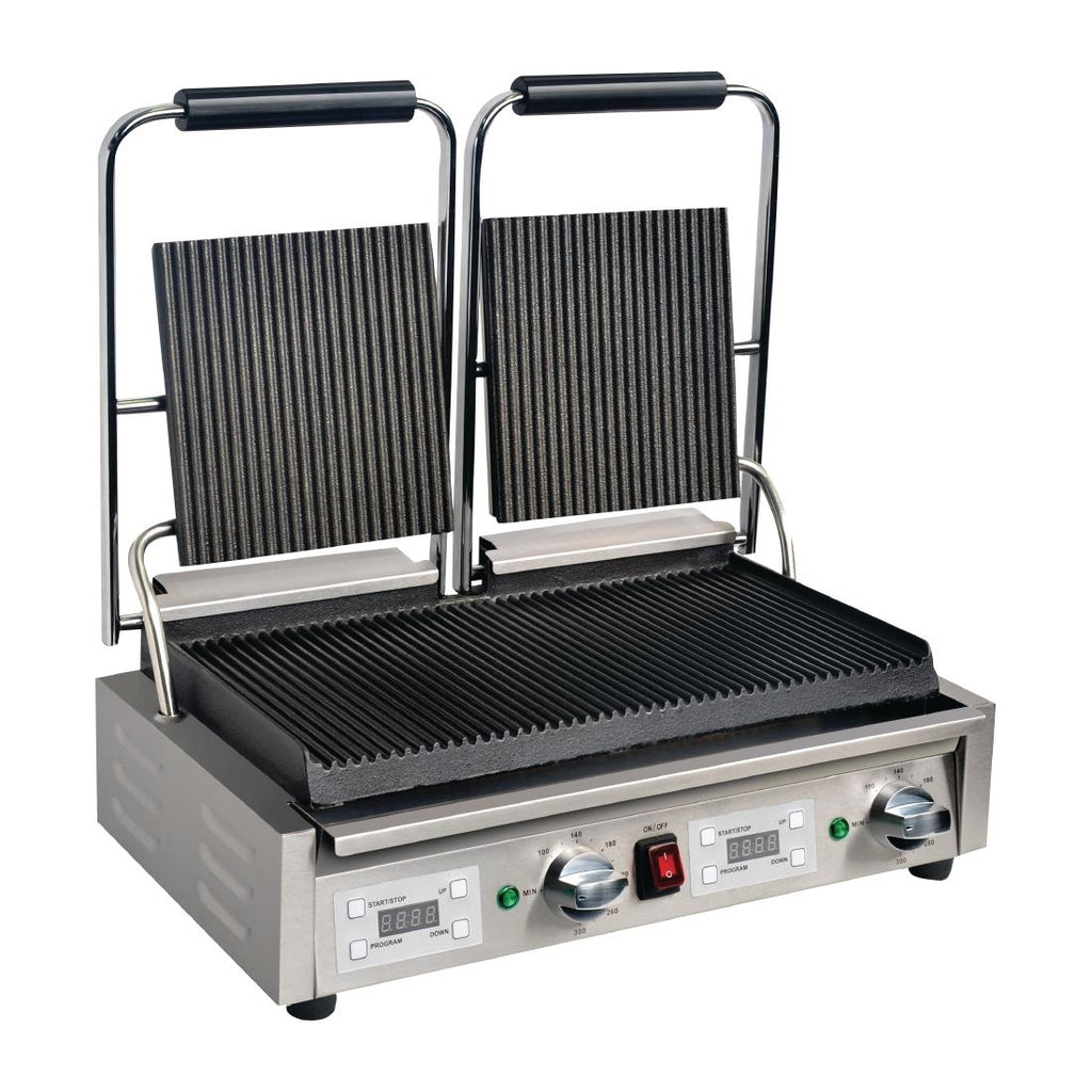 - Adjustable swivel top plates can compress food for consistent cooking results