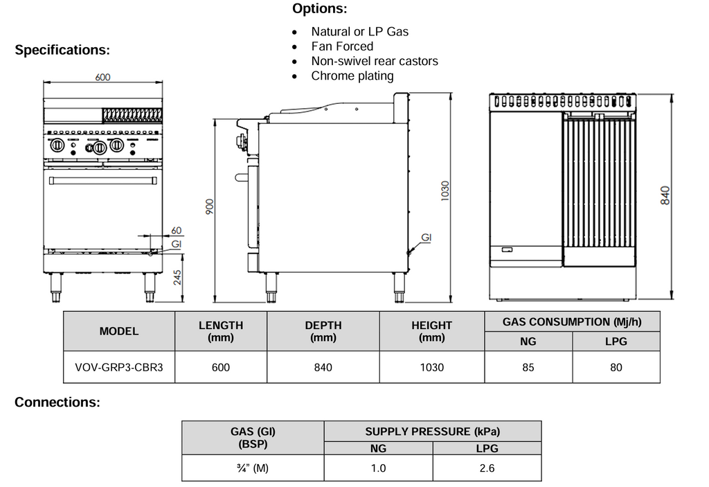 • Internal Oven Dimensions:630mm L x 485mm W x 290mm H