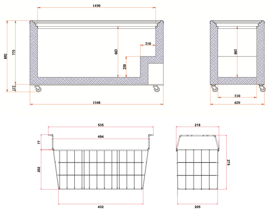 • Internal dimensions (mm): 1430W x 510D x 663H