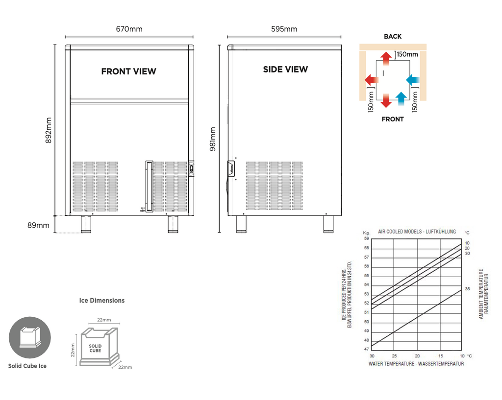 Our Self-Contained Ice Machine is designed to make your life easier. With its all-in-one functionality, it combines ice production and storage, saving you valuable space. It produces up to 59kg of ice daily and 33kg internal ice storage capacity. Enjoy the excellence of large, crystal clear solid cube ice, perfect for beverage-focused applications. The space-saving design allows for under bench installation, while the hygienic Agion®-treated materials guarantee maximum cleanliness. The durable stainless steel construction simplifies maintenance and provides excellent corrosion resistance.