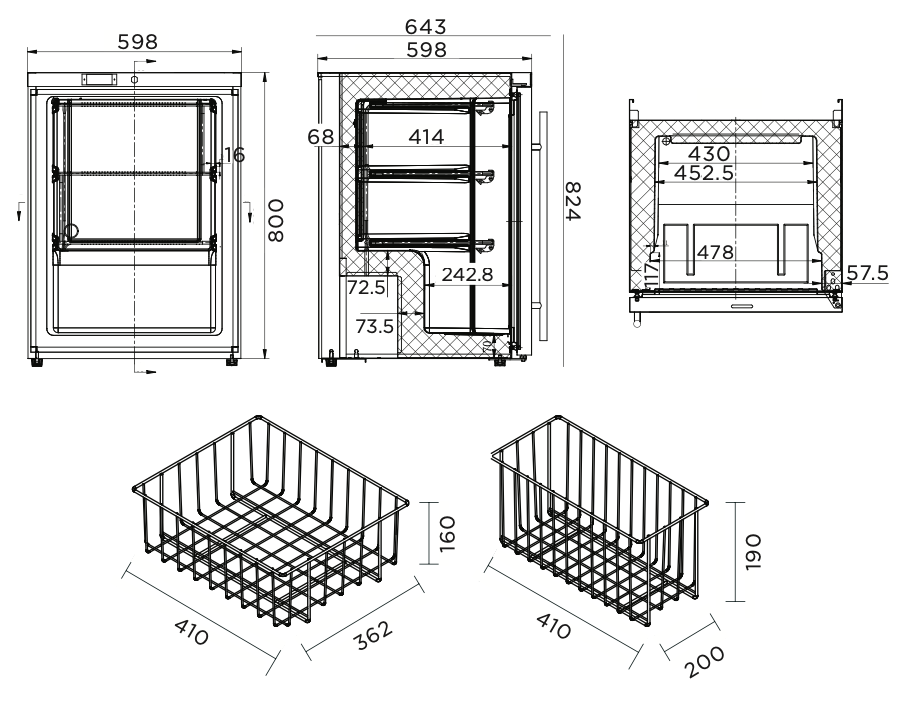 • External dimensions (mm): 595w x 595d* x 820h (*depth dimensions exclude handle protrusion)