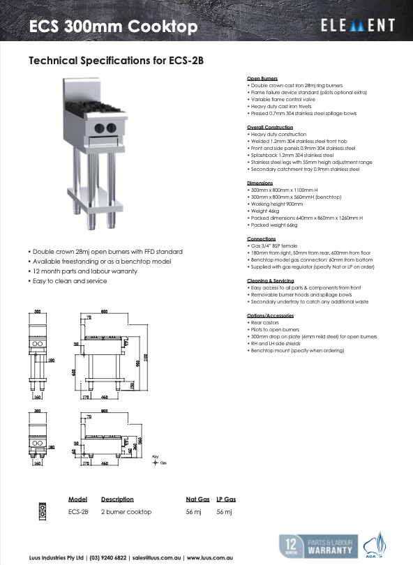 LUUS Element ECS-2B 2 Burner Cooktop 300mm