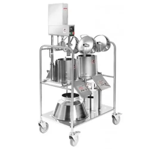 The accessory trolley offers practical storage of accessories and cutting tools. It has space for three feeders and both feed cylinders. Cutting tools can be hung on the trolley in order to provide free space and avoid unnecessary wear. The accessory trolley is the ideal aid for keeping the tools neat and tidy for fast and easily handling and storage. The trolley is made entirely of stainless steel and has sturdy wheels, two of which are lockable.