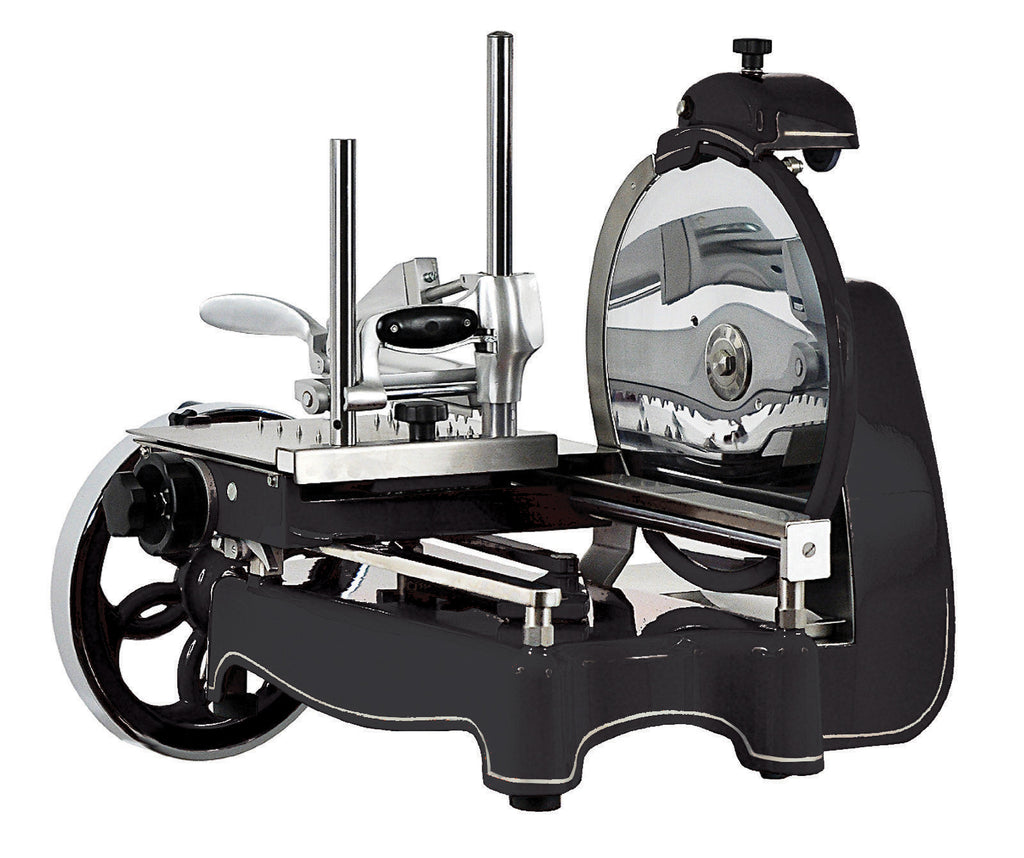 Constructed from aluminium and stainless steel, the Retro Flywheel slicer is a compact machine, specifically designed for use with all cold cut meats, particularly prosciutto.