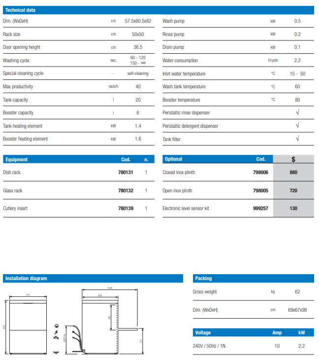- Undercounter dishwasher with 50×50 cm rack, full double-skin side panels with deep-drawn rack guide with rounded edges and full double-skin door.