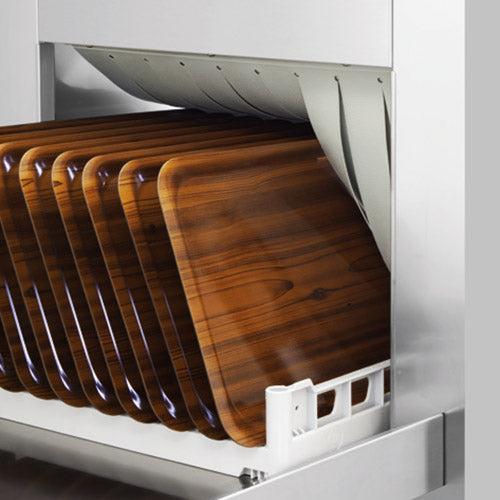 Thanks to the inherently clean construction with fully moulded tanks, washing chamber without internal piping, removable separation curtains in hygienic material. Built-in tank filters and double safety filter on pump extraction.