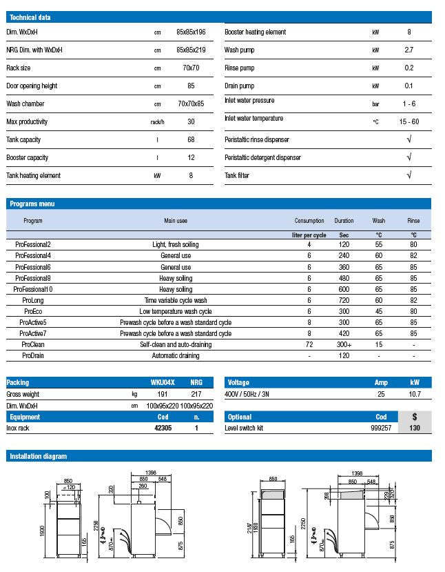 Ideal for large scale catering business, canteens and institutions. Has a 70x70 cm rack and a door opening height of 85 cm. Opened Booster with break tank and rinse pump guarantee constant pressure, temperature and flowrate during the rinse phase. The machine is built in with partial drain system.