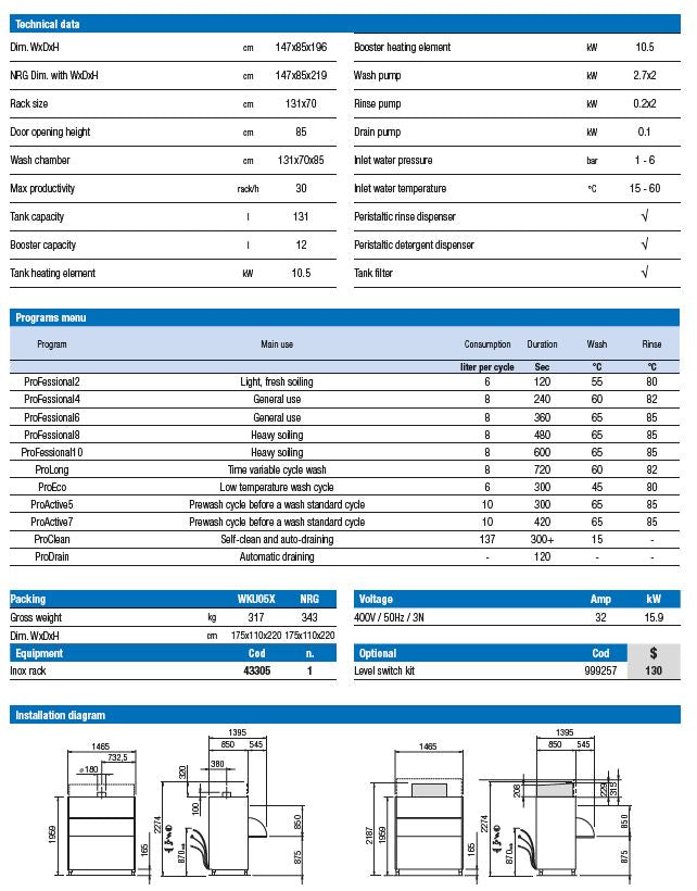 Full options as standard with tank partial drain with pump, rinse aid and detergent dispensers and atmospheric boiler with rinse pump.
